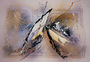 OLD STUFF Unfortunately, this is one of the only pictures I have of the sub-series of work that the gesture paintings became. Dozens of these hybrid works were sold through Ken Hagopian, a Chicago-based art distributor, so I have very little record of where they ended up. These paintings incorporated the slashing gestural compositions of the landscape-based pieces, and added a layer of formalism by way of grids, rectangular frameworks, and geometric accessorization. This is a good stopping point. While there were small forays into subsequent series of paintings over the next 12-15 years, most of these works were experimental. Truthfully, over these years I was fundamentally distracted from my art, focusing instead on the world of science and technology, and making quite a career of this more tractable, more finite universe (the universe of computer science and Information Technology). |