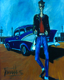OLD STUFF I've got a soft spot for the late fifties. Saturday Afternoon is an example of this. I think I'm charmed by the naivetee of the 'rockers' thinking they were really rebelling against something, something cultural, something that was of significance. God, how nice would a step back to these times be? Balanced composition, cool colors, fun subject matter, manneristic handling of both the technology and the human form, and a molecule of red to show how masterful I am at the warm tones. Okay, so it's not that masterful. The piece was fun to paint, and is still fun to look at. Next we'll peek into a darker series, a series that explores, well, darker stuff. |